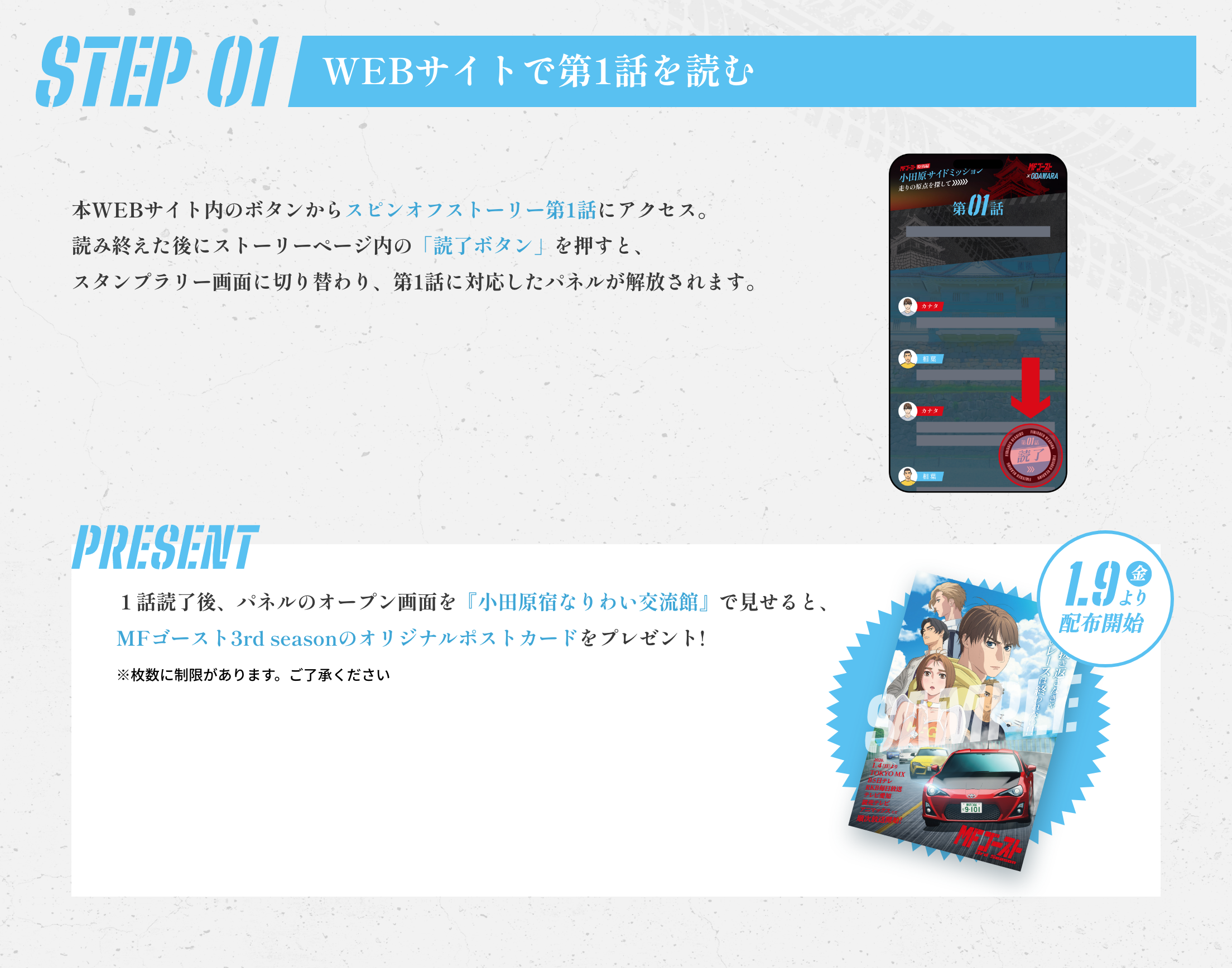 「MFゴースト」第1戦小田原パイクスピークでは、店舗周辺の風景が描かれている。